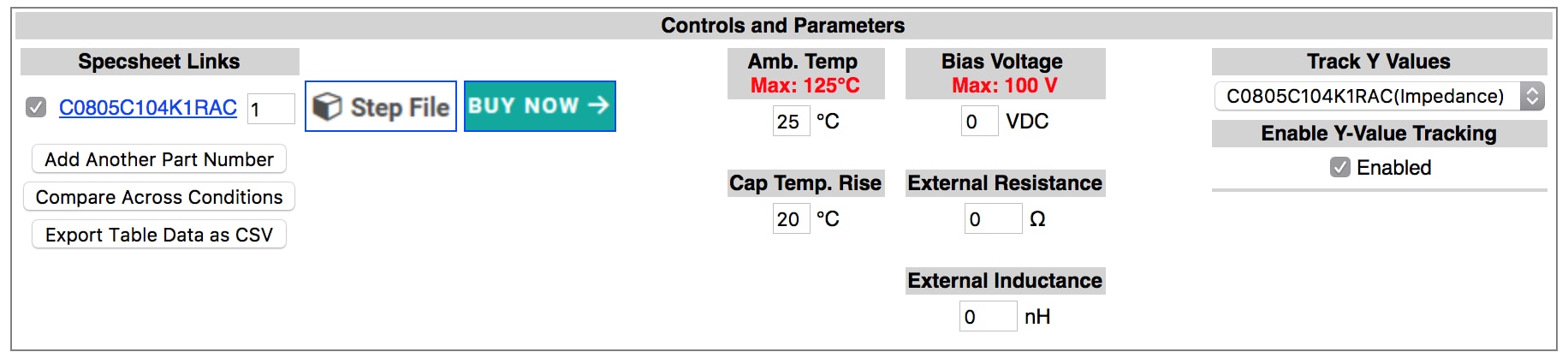 Once a graph is selected, there are controls to allow you to enter an applied voltage and application temperature. There are various other controls also available, but these two are the most common. For some advanced comparisons, try clicking “Compare Across Conditions,” then you can see how a part performs, on a single graph, at -55°C, 25°C, and +125°C.